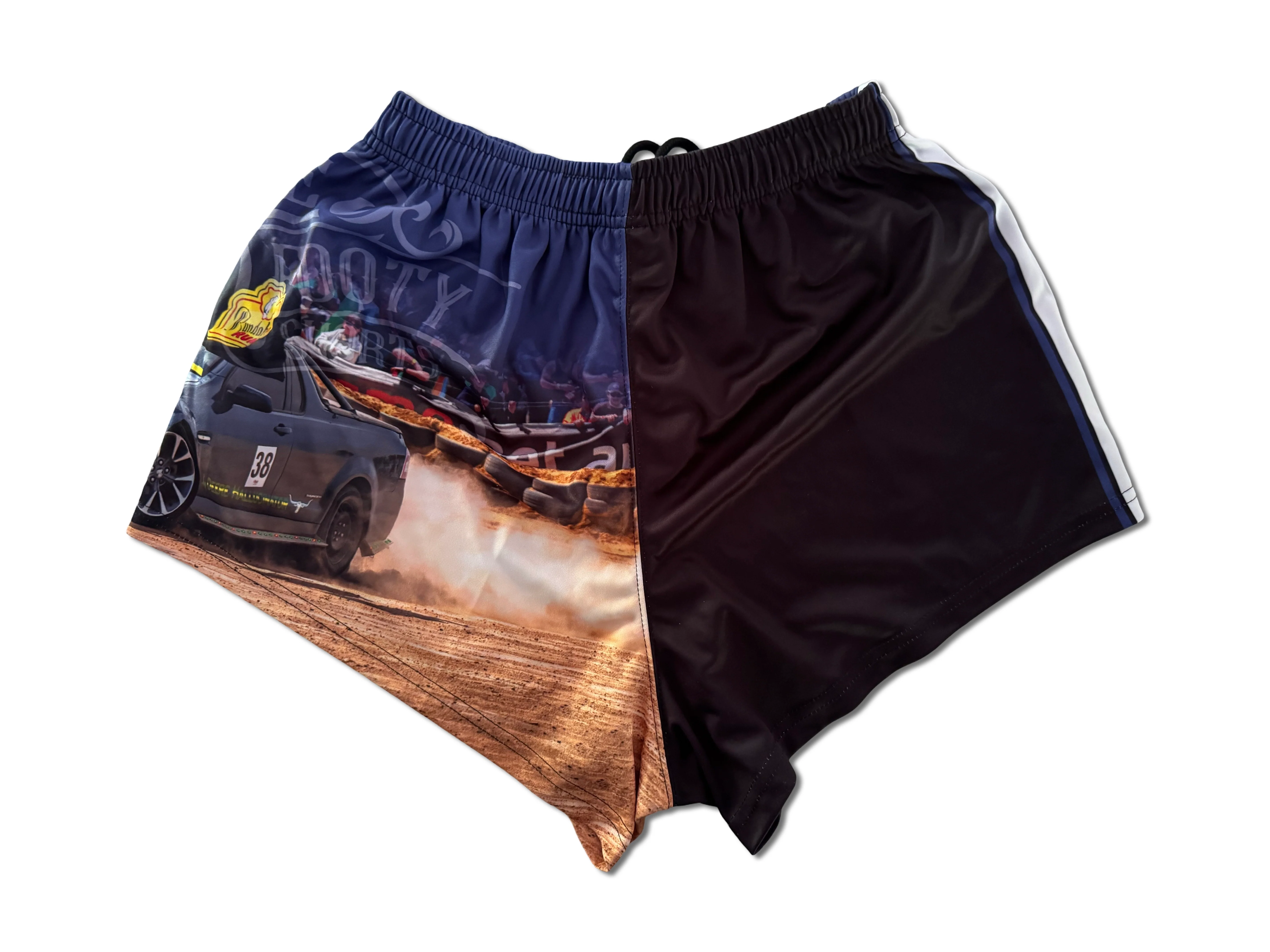 🛻 For the kings of the bunout pad and the legends who don't lift. These high-quality footy shorts are an ode to power slides, high revs, and that unmistakable scent of cooked rubber. One leg features a full-blown photo print of a beefed-up ute lighting it up, while the other keeps it clean with AFS branding and contrast panelling. These aren't just shorts — they're a lifestyle choice.