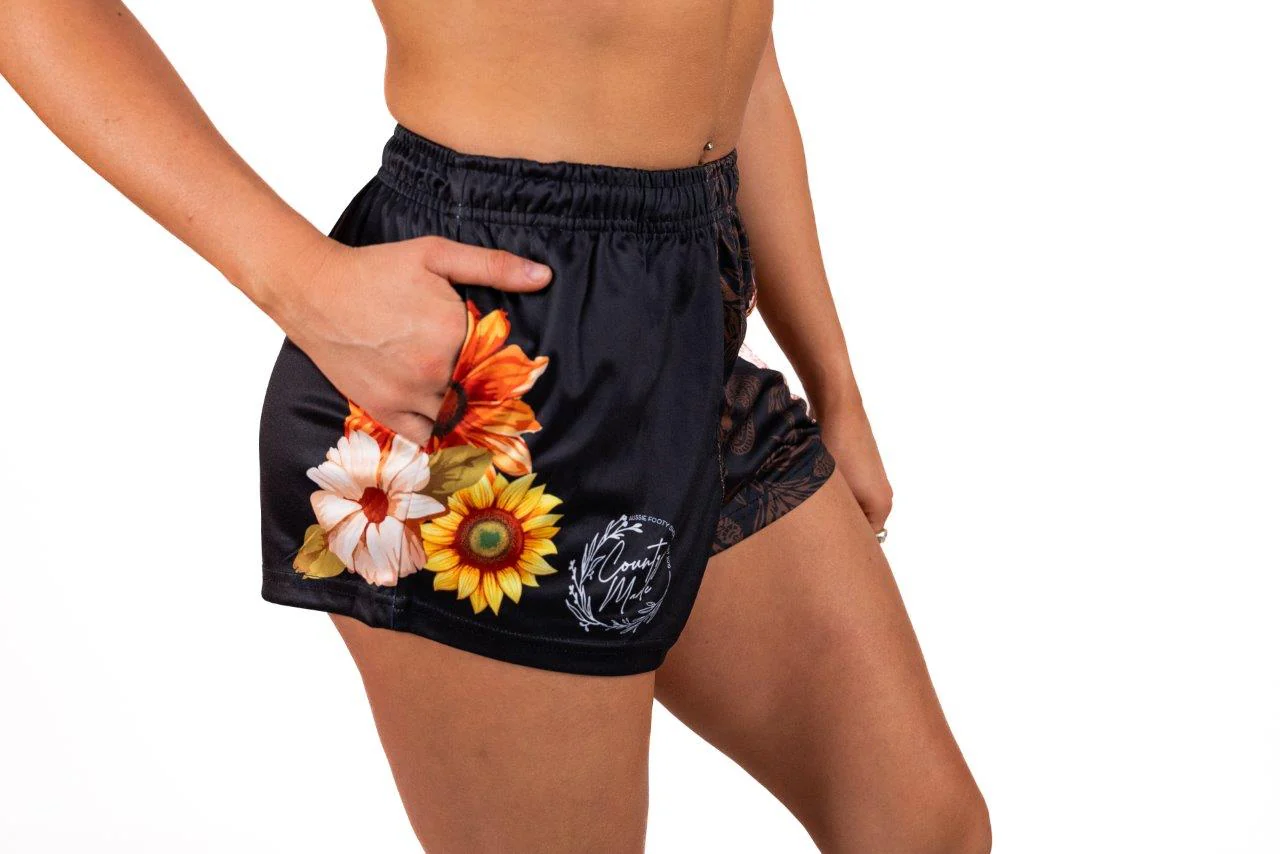 🌼🌷 For the girls who pair muddy boots with big smiles and even bigger sass. These women's footy shorts mix bold florals with rodeo grit — sunflowers, paisley, and a classic cowgirl boot design that's as much about attitude as it is about looks. Whether you're at the rodeo, in the paddock, or cracking a tin at sunset, these shorts are built to shine as bright as you do.